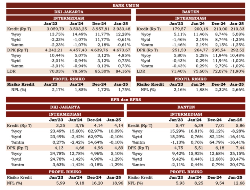 Di Banten, pertumbuhan perbankan juga positif. Penyaluran kredit di Bank Umum tumbuh 5,08% menjadi Rp210,33 triliun, dengan kredit konsumsi sebagai yang terbesar (52,35%), terutama untuk kepemilikan rumah tinggal.