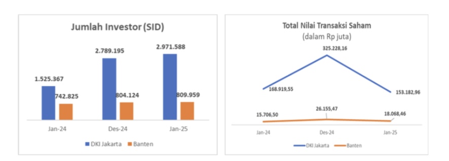 Transaksi saham di DKI Jakarta mencapai Rp153,18 miliar, mayoritas dilakukan oleh masyarakat Jakarta Selatan (40,87%). Di Banten, transaksi saham tercatat Rp18,07 miliar, dengan dominasi investor dari Tangerang Kota (58,36%).