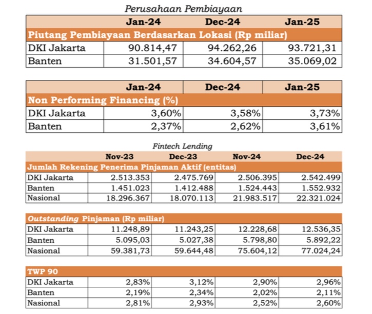 Industri keuangan non-bank (IKNB) terus menunjukkan performa positif, baik di sektor pembiayaan maupun fintech lending. Piutang pembiayaan di DKI Jakarta tumbuh 3,20% menjadi Rp93,72 triliun, sementara di Banten meningkat lebih tinggi, 11,32% menjadi Rp35,06 triliun.