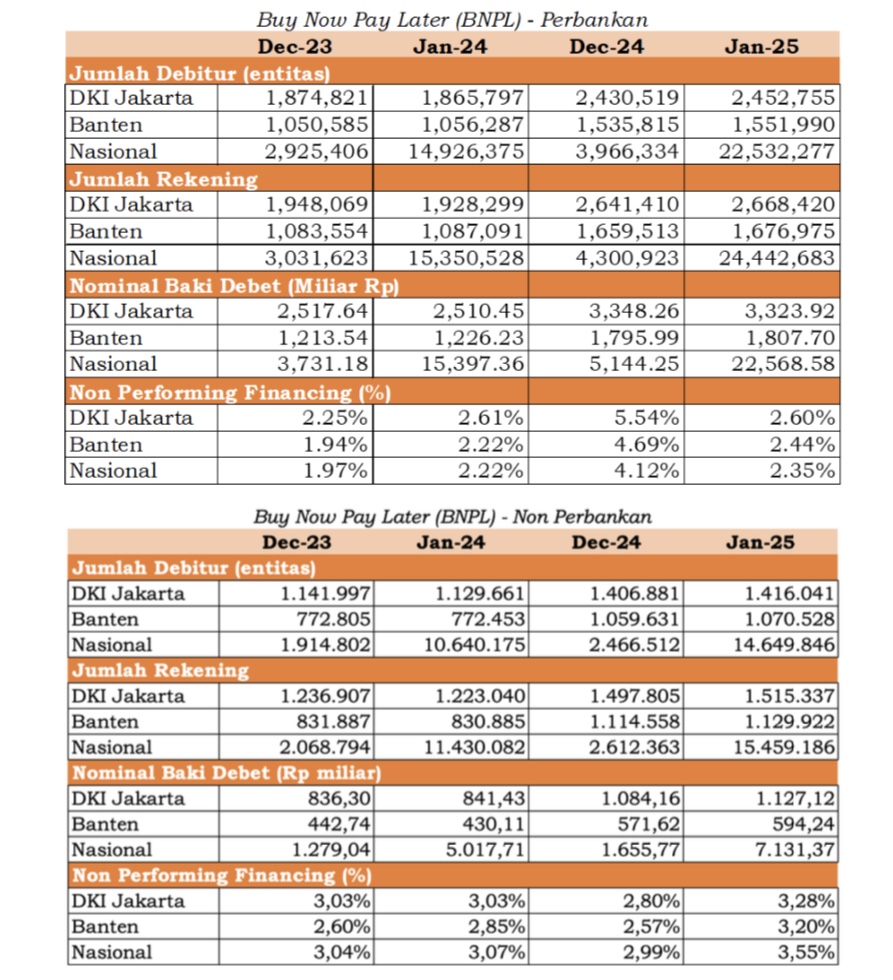 Di sisi lain, layanan Buy Now Pay Later (BNPL) terus berkembang pesat. Di DKI Jakarta, jumlah debitur BNPL naik 31,46% menjadi 2,45 juta, sementara di Banten melonjak 46,93% menjadi 1,55 juta. Namun, risiko kredit mulai meningkat. Rasio kredit macet (NPF) BNPL di perbankan DKI Jakarta mencapai 2,60%, sedangkan di Banten 2,35%, lebih tinggi dari rata-rata nasional.